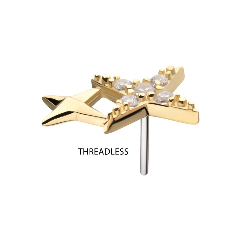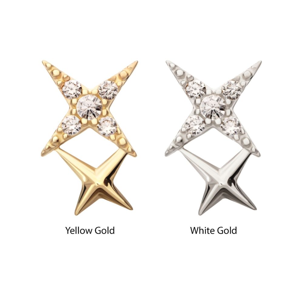 The 14K Celestial Star Top is a sleek threadless push pin that brings together bright shine and golden warmth in one elegant piece. Made from solid 14K yellow gold, it features a polished star design that represents light and beauty. Its smooth lines and reflective finish create a classic yet modern accent for any piercing.