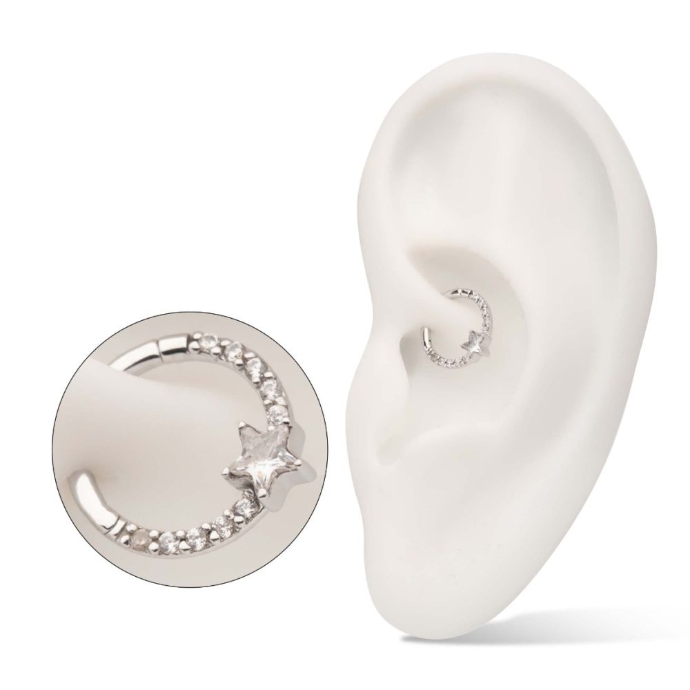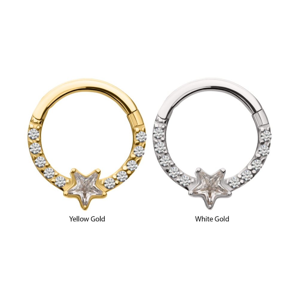 Built for everyday wear, the 14K Star Shine Clicker is lightweight, secure, and comfortable in placements like the septum, daith, or helix. Its solid gold construction makes it hypoallergenic and safe for sensitive skin. Furthermore, the polished detailing ensures lasting shine and durability. Designed with both simplicity and a touch of sparkle in mind, it’s a versatile piece that suits any style.
