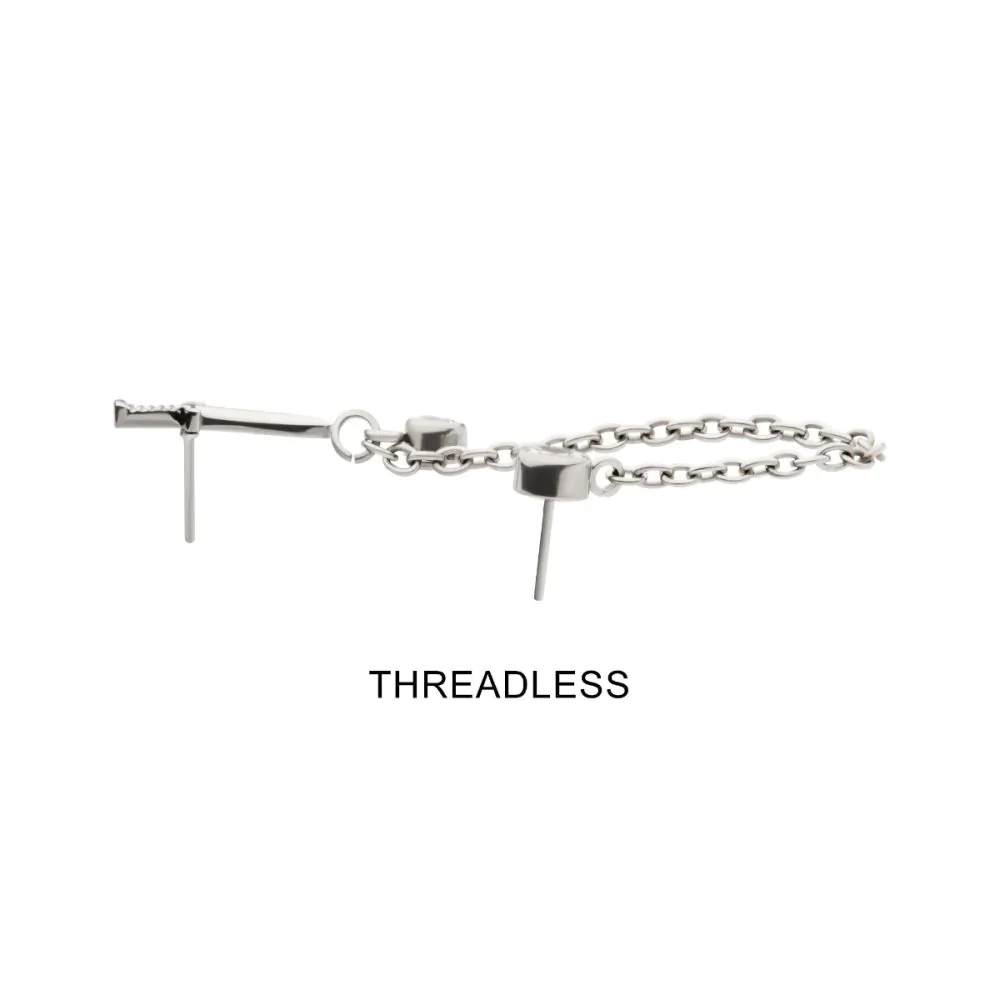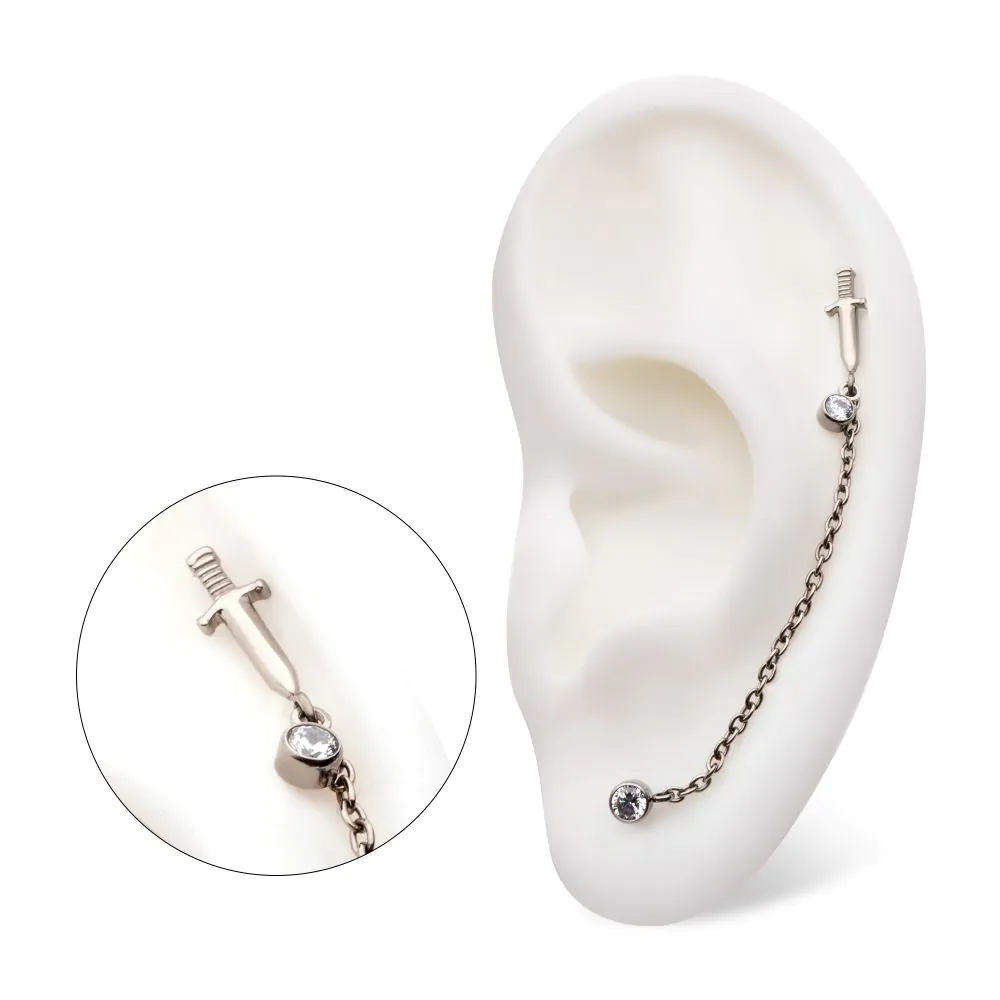 The Dagger & Duo Bezel with Chain Dangle is a bold threadless push pin that fuses sleek design with refined sparkle. Crafted from high-quality titanium, it features a sharp dagger motif paired with two bezel-set cubic zirconia stones and a delicate chain dangle, adding layers of shine and movement for a striking, modern look.