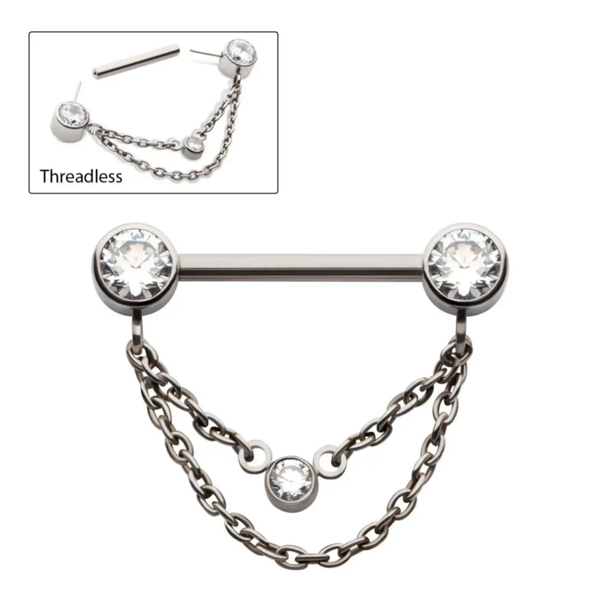 Each nipple barbell features bezel-set gems on both ends, connected by two delicate chains that add elegant drape, gentle sway, and a hint of shine. The chains catch the light just enough to stand out, while the gem ends offer a polished, versatile finish.
